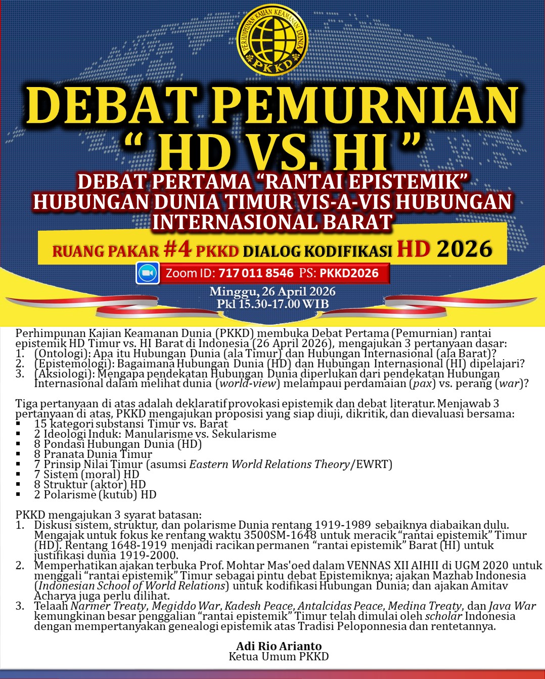 “DEBAT PEMURNIAN HD VS. HI: DEBAT PERTAMA RANTAI EPISTEMIK HUBUNGAN DUNIA TIMUR VIS-A-VIS HUBUNGAN INTERNASIONAL BARAT” (INDONESIA, 26 APRIL 2026)