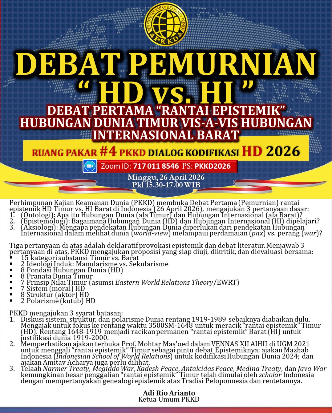 Ruang Pakar Ke-4 Perhimpunan Kajian Keamanan Dunia (RP4-PKKD) has declared “PEMURNIAN DEBATE WR VS. IR: THE FIRST DEBATE ON EPISTEMIC CHAIN OF EASTERN WORLD RELATIONS VIS-A-VIS WESTERN INTERNATIONAL RELATIONS” on 26 April 2026 that was attended by 40 Indonesian Scholars as Declarators and 1 Initiator, namely Adi Rio Arianto, who also serves as the General Chairman of the PKKD. The following are the names of the Declarators and Initiators (40+1) “Pemurnian Debate 2026″: