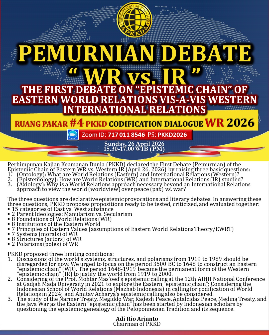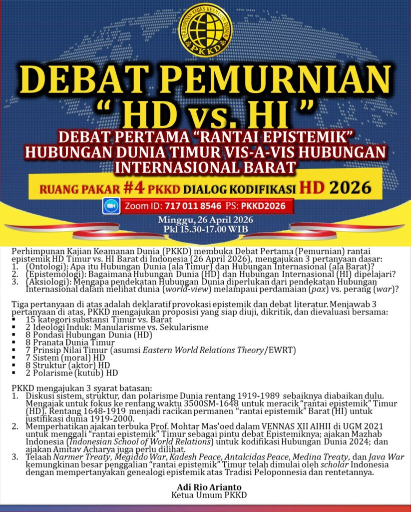 Ruang Pakar Ke-4 Perhimpunan Kajian Keamanan Dunia (RP4-PKKD) telah membuka “DEBAT PEMURNIAN HD VS. HI: DEBAT PERTAMA RANTAI EPISTEMIK HUBUNGAN DUNIA TIMUR VIS-A-VIS HUBUNGAN INTERNASIONAL BARAT” pada 26 April 2026 yang diikuti 40 Scholars Indonesia sebagai Deklarator dan 1 Inisiator atau penggagas yaitu Adi Rio Arianto sekaligus sebagai Ketua Umum PKKD. Berikut adalah Nama-Nama Tokoh Deklarator dan Inisiator (40+1) “Debat Pemurnian 2026”: